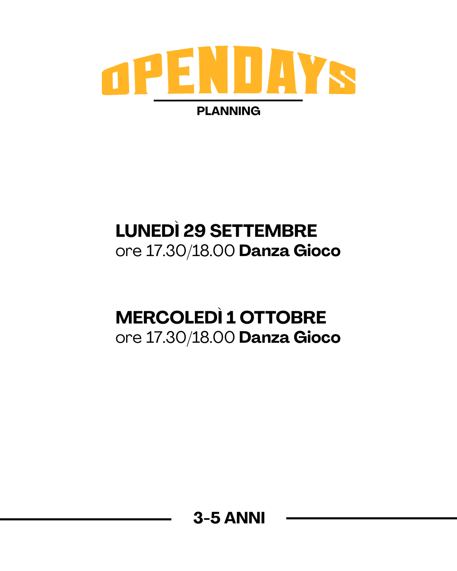Porta il tuo bambino a conoscere i corsi pensati per la sua età! Durante gli Open Day potrà provare mini-lezioni da 30 minuti, seguiti dai nostri insegnanti, in un ambiente sicuro e divertente.È il modo migliore per conoscere la scuola e vivere un'esperienza nuova insieme.